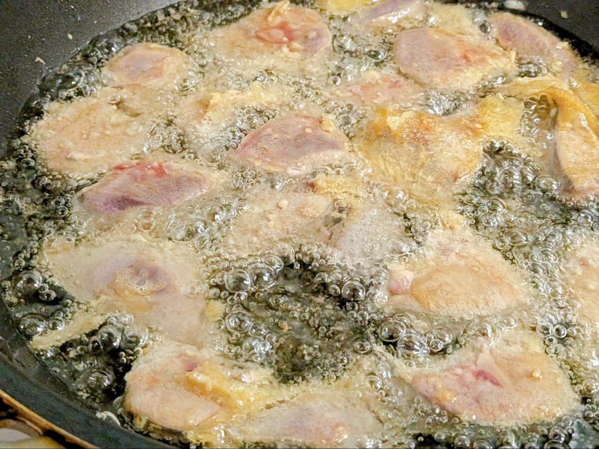 ②で用意したレバーは、冷たいままの油に広げて入れ、ゆっくりと火を通しましょう。