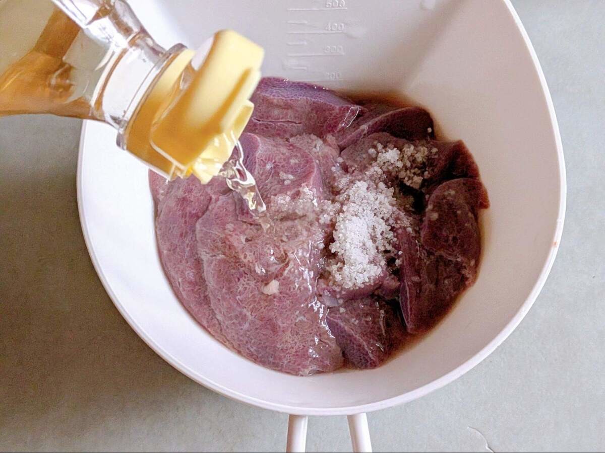きれいに洗ったらボウルに移し、【レバー仕込み】の酢と塩を加え、軽く混ぜ込みます。