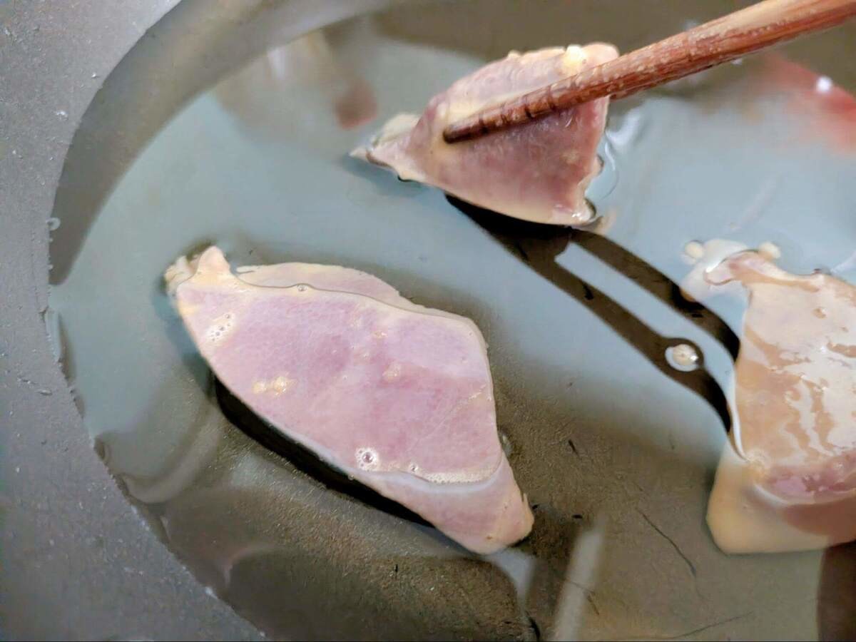 10〜15分漬け、再び揉み込み、水が透明になるまで洗い流します。これでレバーの臭みがだいぶ取れるそう。