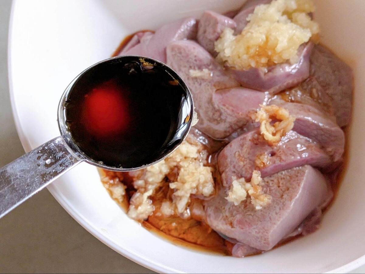 ①に【レバー下味と衣】の醤油、 にんにく、生姜、オイスターソース、酒、ゴマ油を加え、軽く揉みこみます。