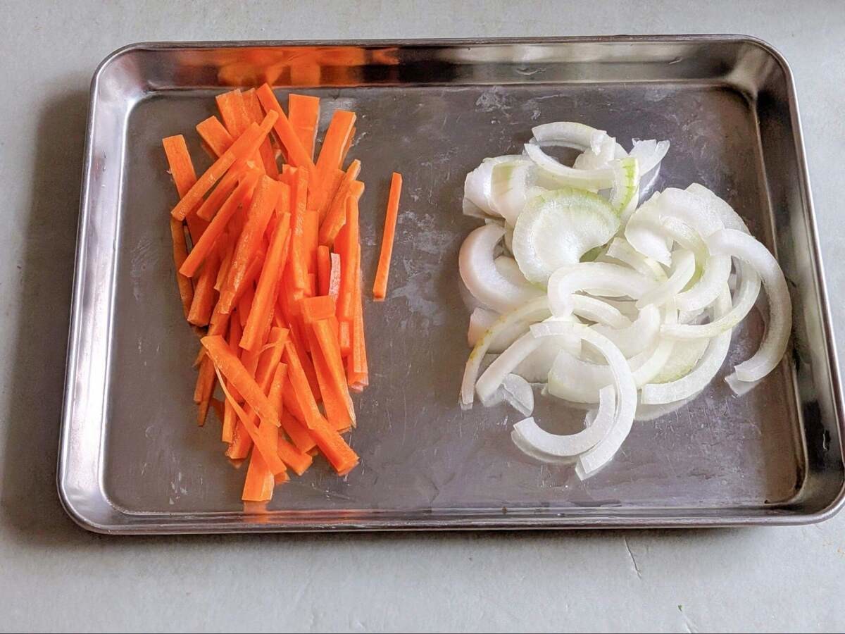 にんじんはせん切りに。玉ねぎは火が通りやすいように、繊維に対して垂直に包丁を入れてカットします。