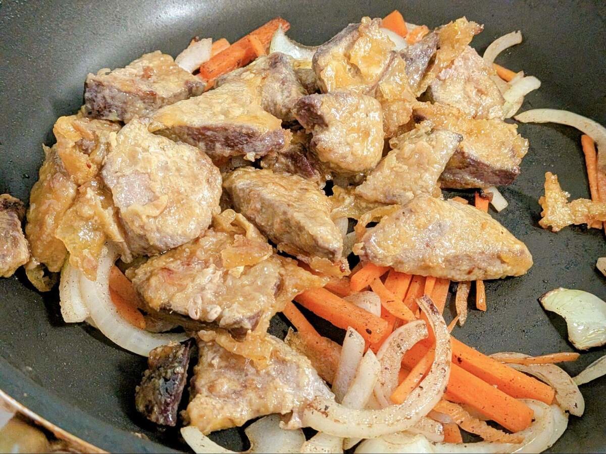 今回は、小さめの玉ねぎを1/2個、レバーの200gパックをスライスして使用したところ、2〜3人分くらいの量ができあがりました。
