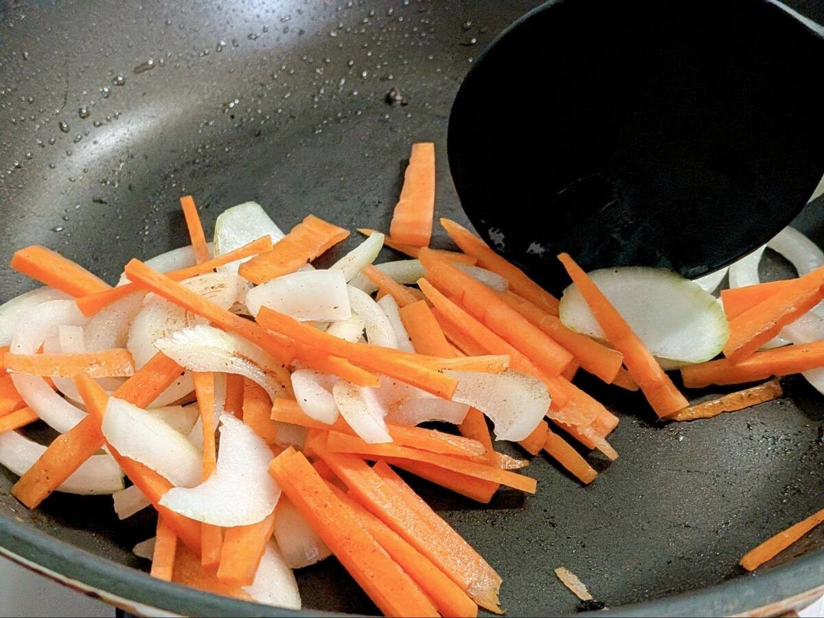 ④で使ったフライパンから油を除き、そのまま使います。少しの油(分量外)をひき、中火でにんじんと玉ねぎを炒めてください。