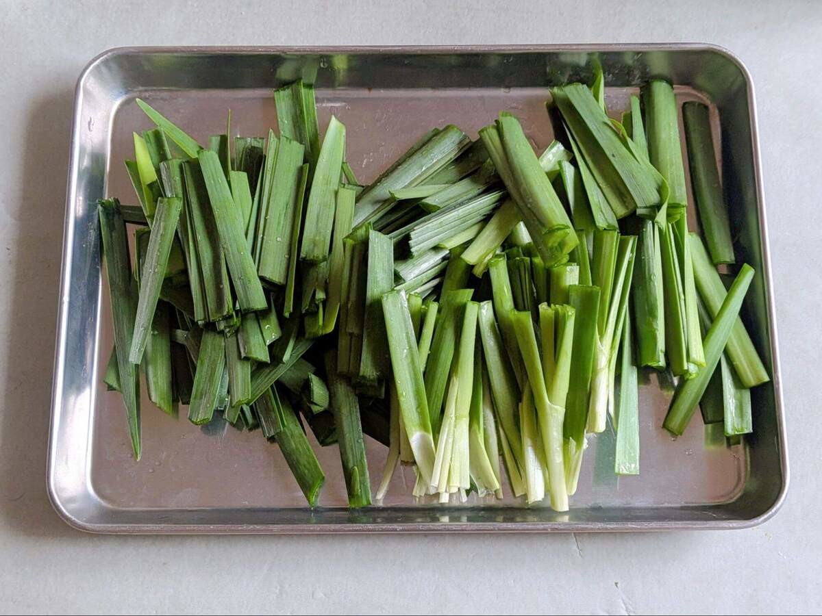 ニラは根元のかたい部分に縦に包丁を入れてから、好みの長さにカット。こうすることで、やわらかい部分とかたい部分の火の通りが均一になるそうです。