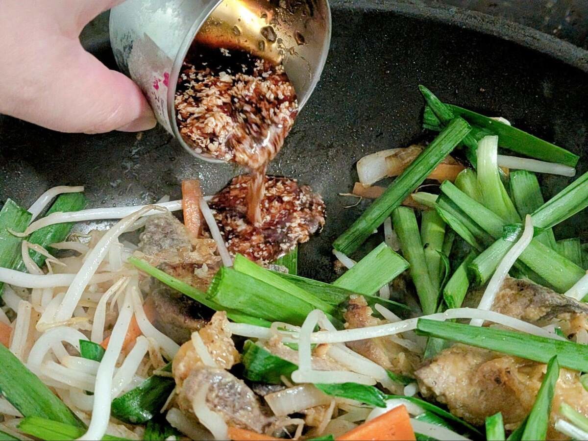 最後に【後入れ調味料】の胡椒とゴマ油をかけてできあがり。