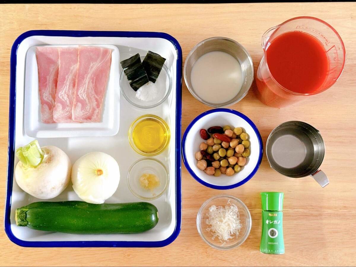 ズッキーニは輪切り、玉ねぎはひと口大に、カブはくし切りにします。ベーコンは粗めのみじん切りに。