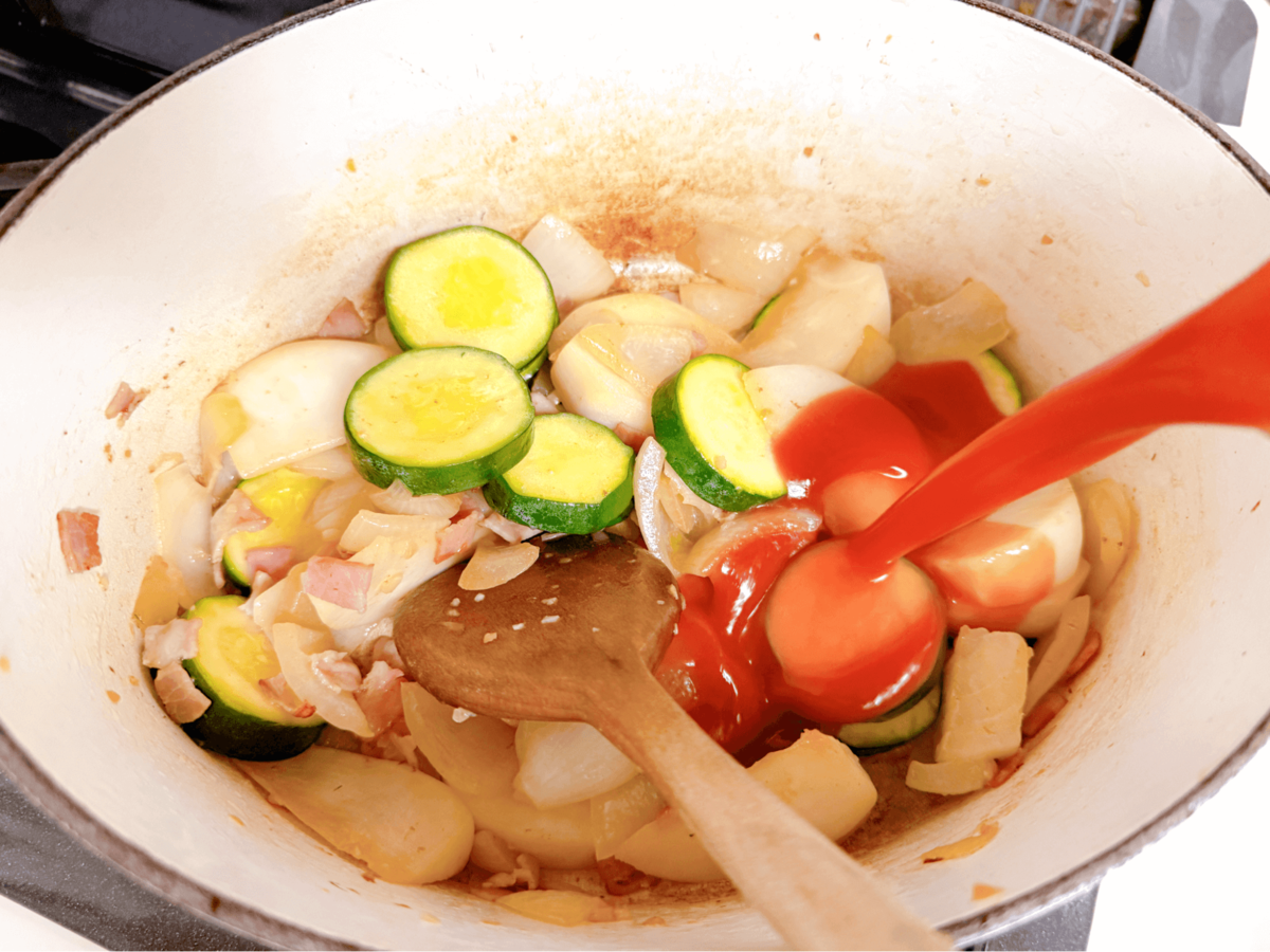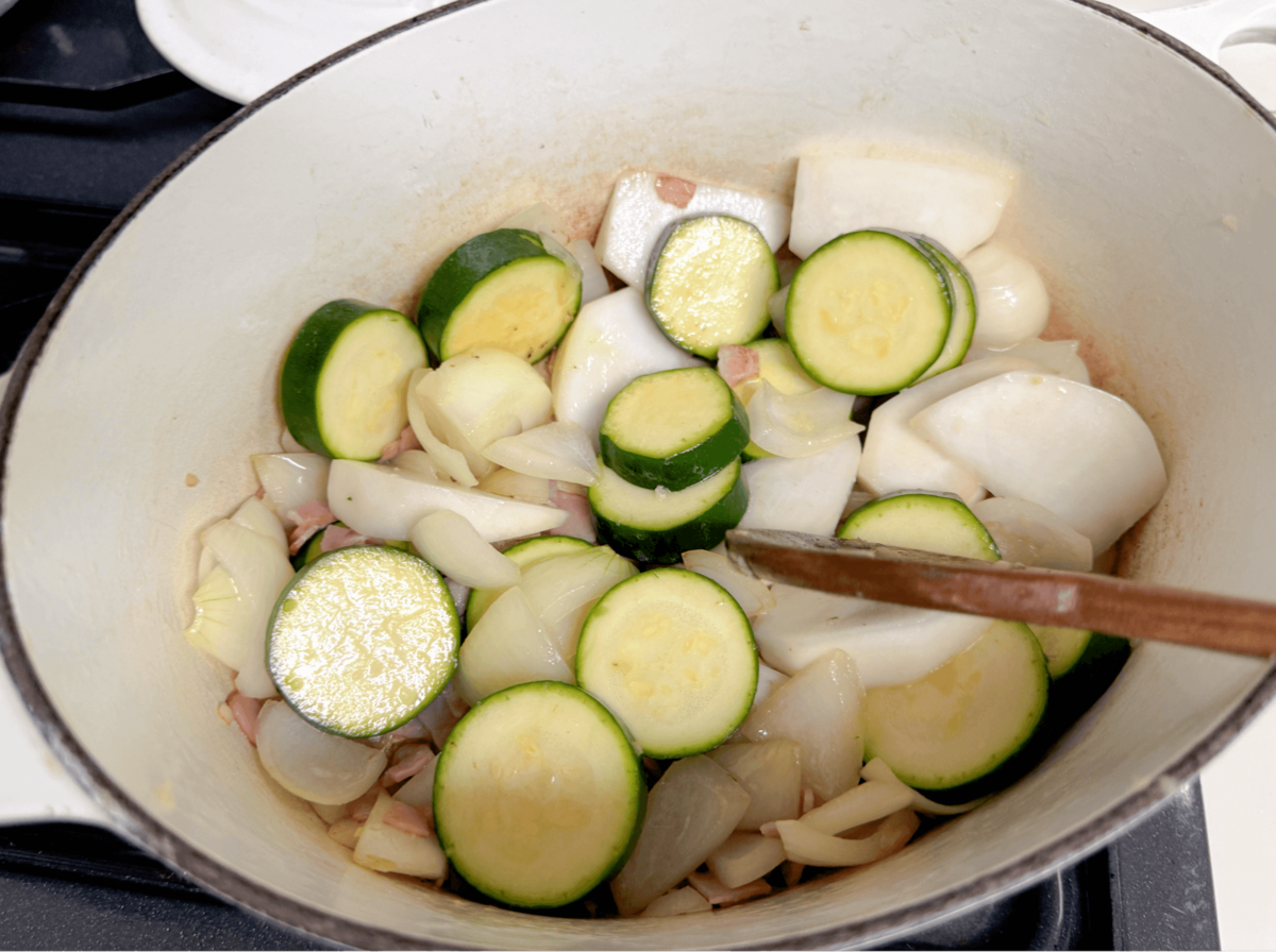 深めの鍋にオリーブオイルを熱したら、薄切りにしたにんにく、ベーコンと玉ねぎを順に加え、さらにズッキーニとカブ、ミックスビーンズを入れて炒めます。
