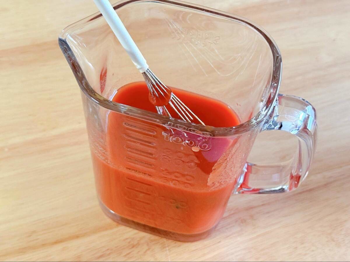 ボウルなどの容器にトマトジュース、水、出汁昆布、塩を入れて合わせます。