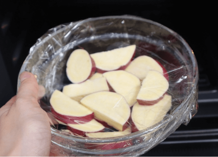 さつまいもの水気を切ったら耐熱皿に入れ、ふんわりラップをして電子レンジ600Wで5分間加熱します。