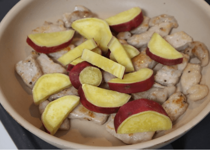 豚肉に焼き色がついたら、電子レンジで加熱したさつまいもを投入しましょう。