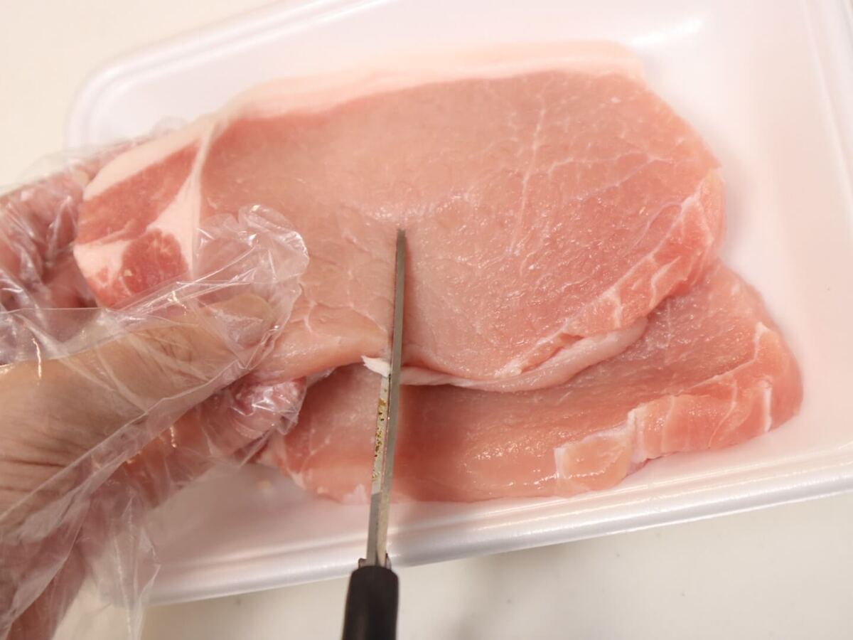豚肉をキッチンバサミで食べやすい大きさに切ります。