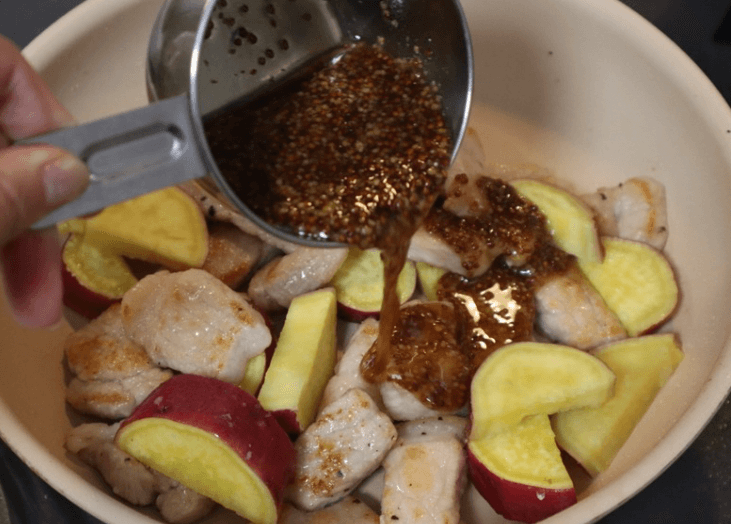 豚肉とさつまいもを炒めたら、混ぜておいたソースを回しかけます。