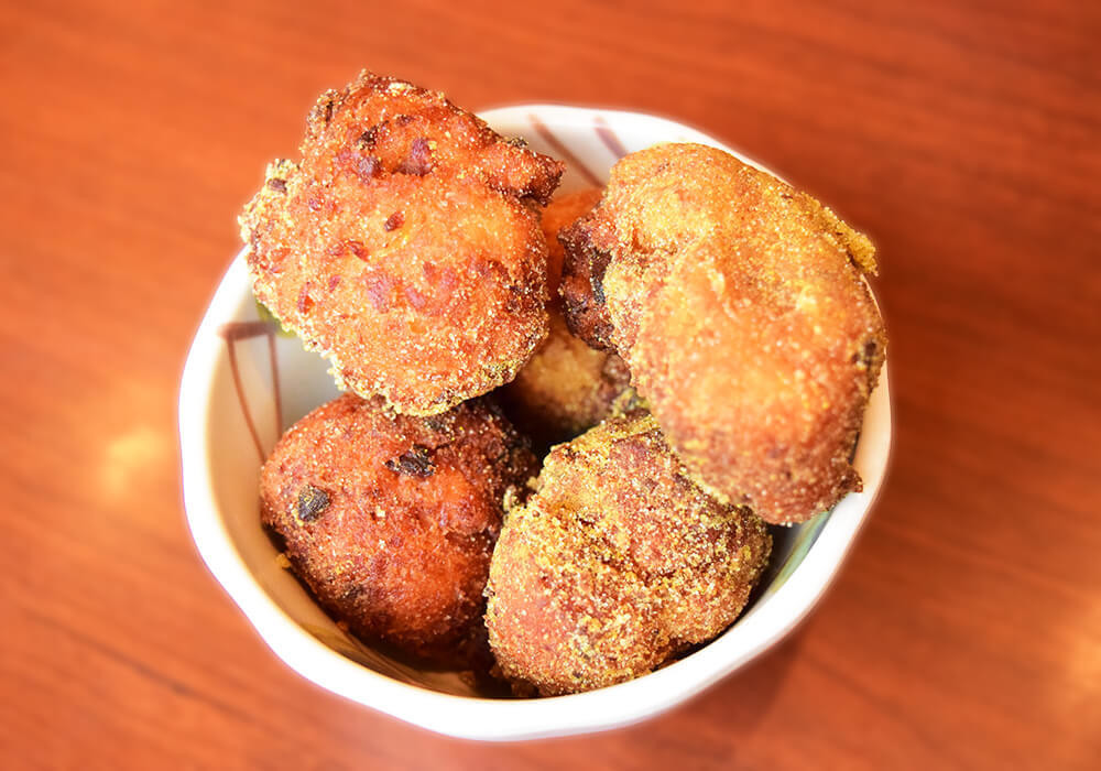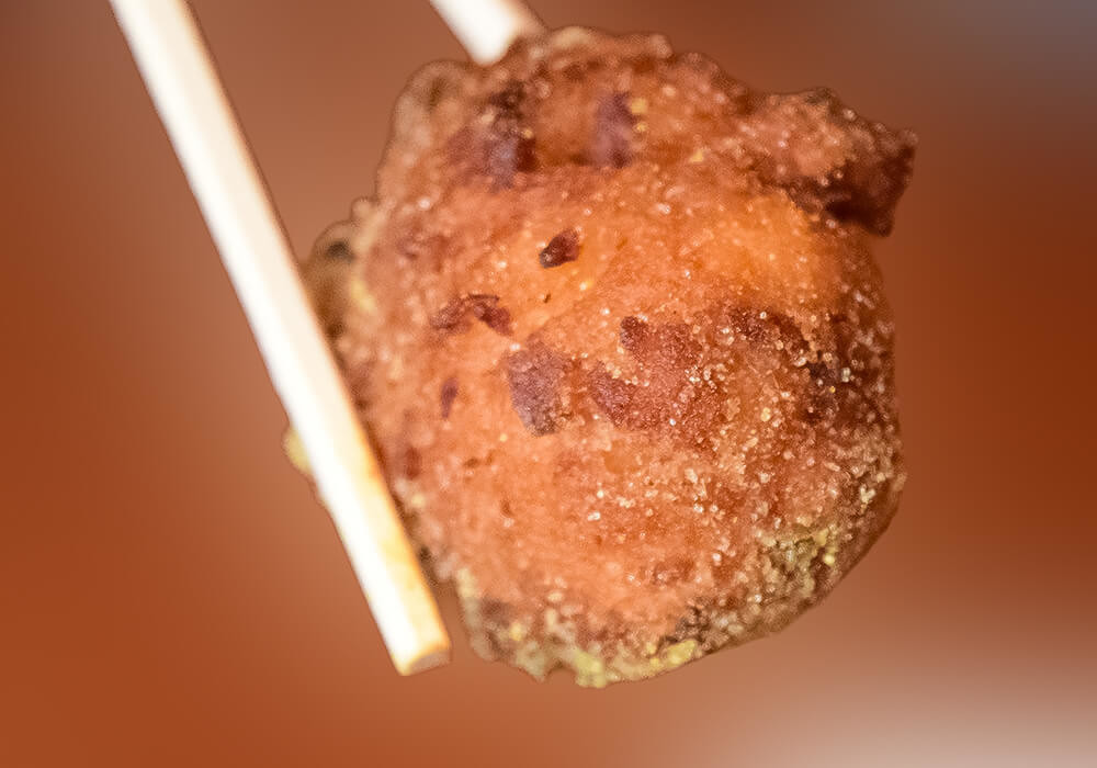 2025年10月7日から全国の丸亀製麺で販売している「うどーなつ まろん味」。うどーなつの生地にさまざまな大きさに砕かれた「栗の甘露煮」が含まれています。「渋皮栗ペースト」でまろやかな栗の味わいも。そんなうどーなつ生地に、栗味パウダーを絡ませて食べる一品。