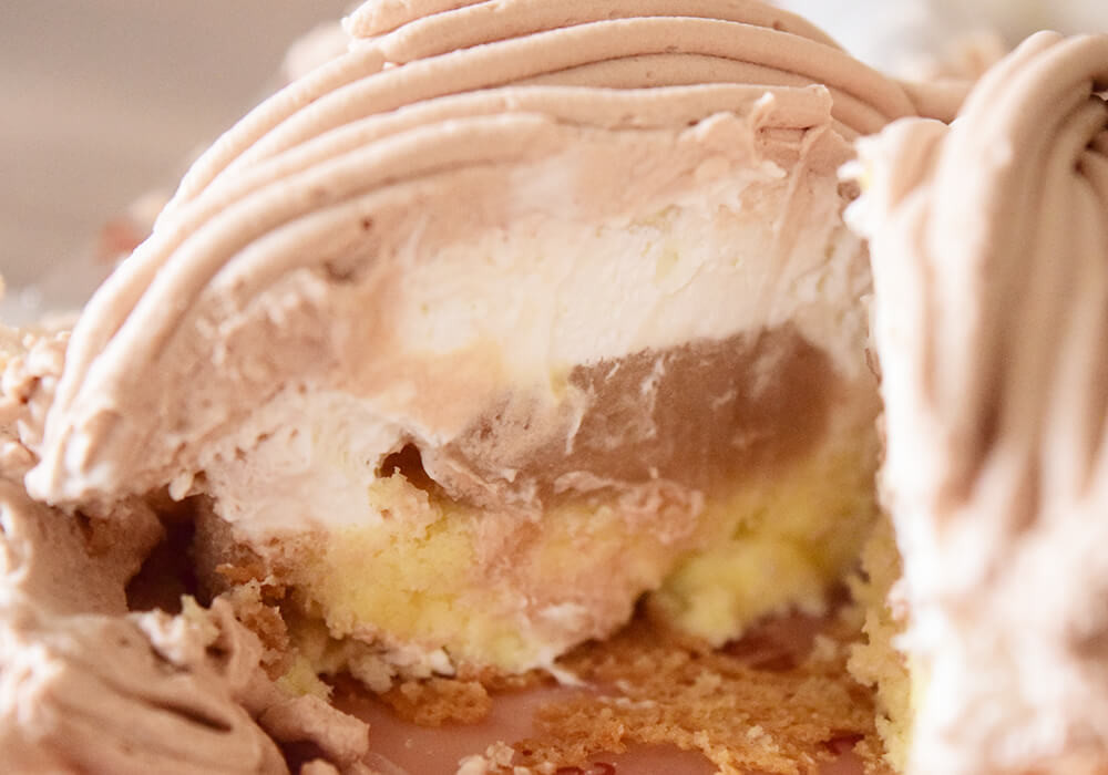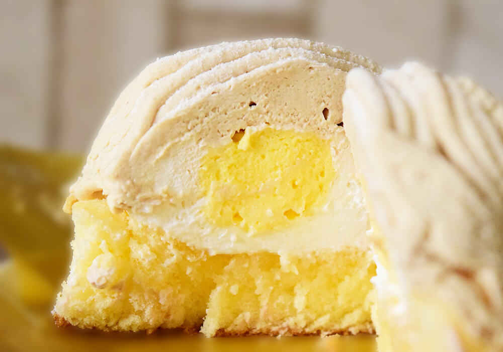 中にはカスタードムースが入っており、口に入れた瞬間にふわっと華やかな洋酒の香りが広がります。クリームは全体的に軽やかな口当たりで、栗らしさを感じるのは主に栗クリームの部分のみ。下の層は生クリーム入りのロールケーキのような仕上がり。