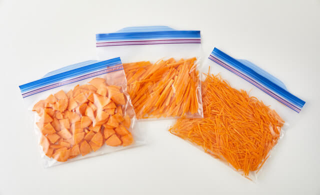 皮をむいた人参を、薄いいちょう切りや、細切り、スライサーで薄くスライスなどして、冷凍用保存袋に薄く平らになるように入れましょう。