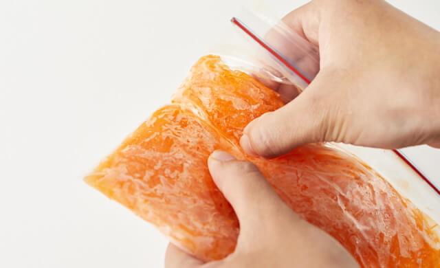 ②冷凍用保存袋にオレンジジュース(大さじ3)と①を入れ、薄く平らにして冷凍する。