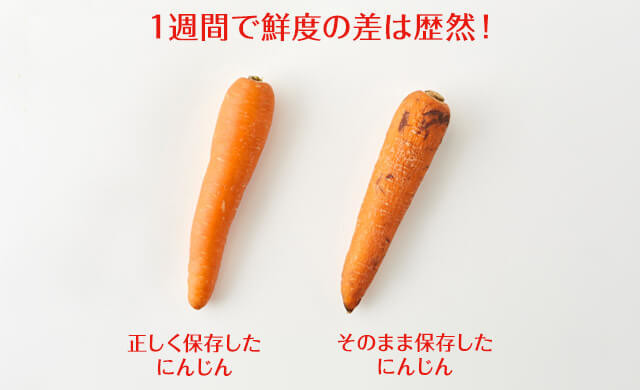 むき出しのまま冷蔵保存した人参と、上記のテクニックで保存した人参の比較写真がこちら。