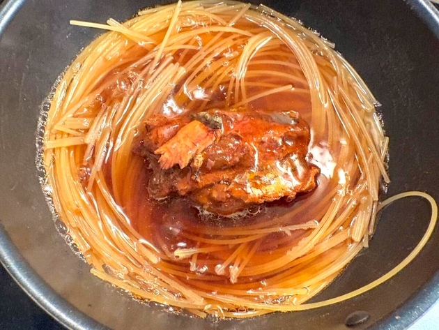 パスタがお湯に浸かったら、サンマ蒲焼缶詰を汁ごと入れて、醤油とうまみ調味料を加えます。