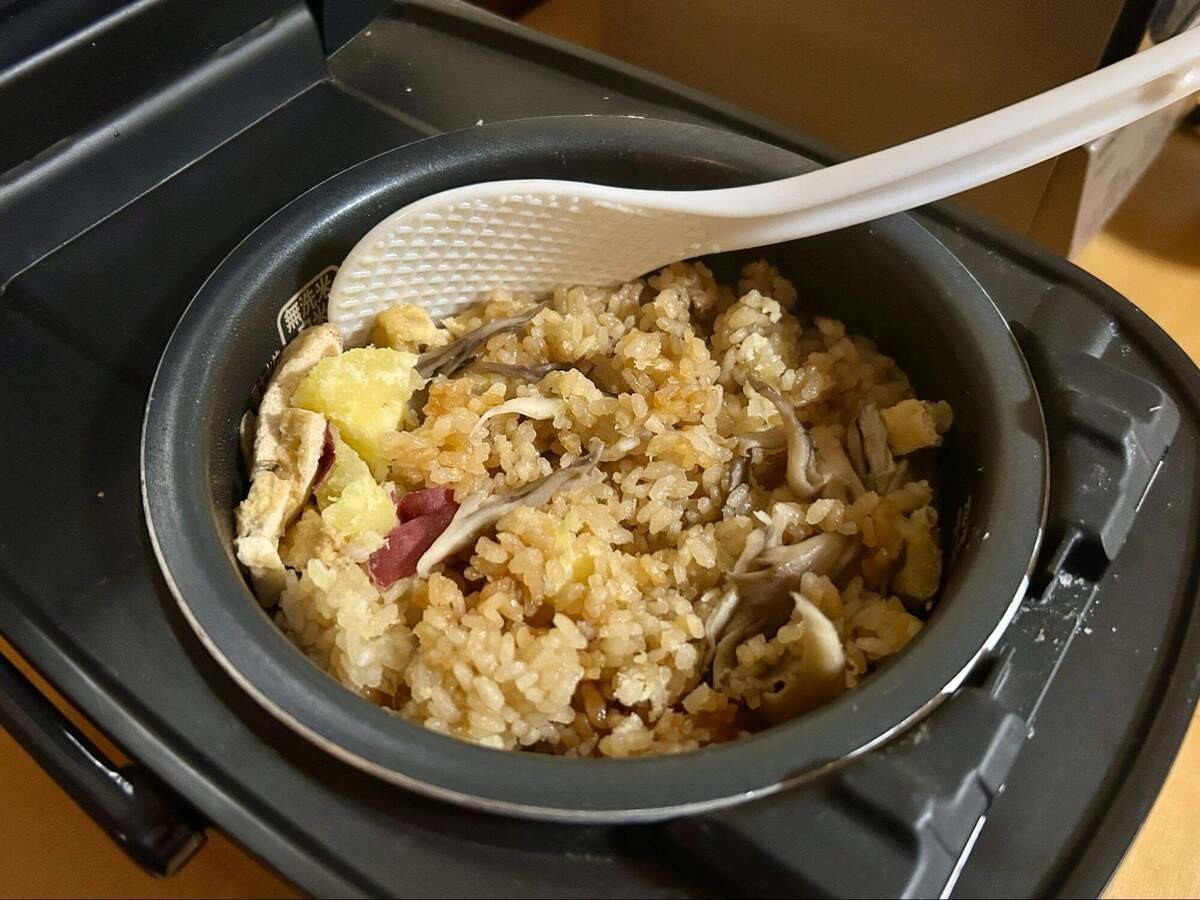 炊飯中からさつまいもの甘い香りと醤油の香ばしさがキッチンに広がり、炊飯器の炊き上がりの音を心待ちにしていました!