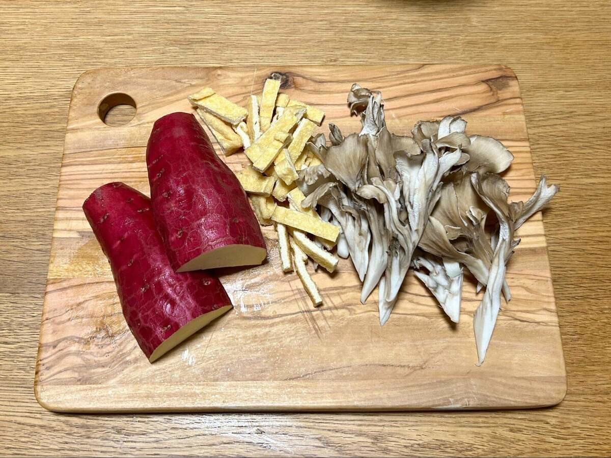 油揚げは短冊切り、舞茸は小房に分けます。そしてさつまいもは縦半分にカット。