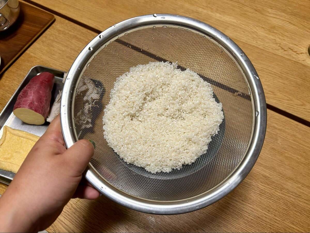 まずは米を研ぎ、ザルにあげて水気を切っておきます。