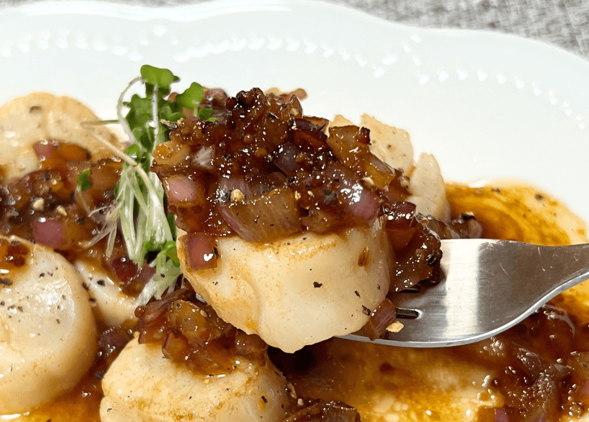 ササッと表面を焼いたホタテ、そして濃厚なソースのダブルの美味しそうな香りがこちらまで十分届いています。