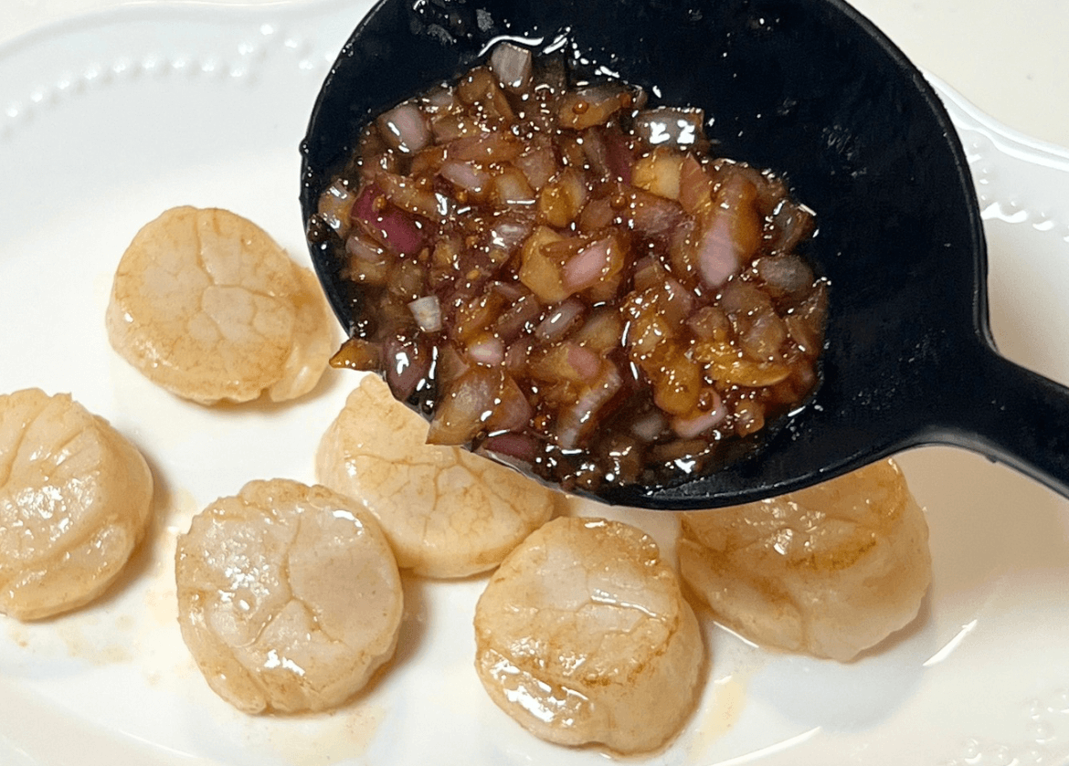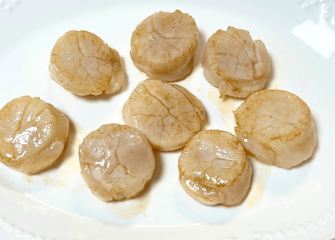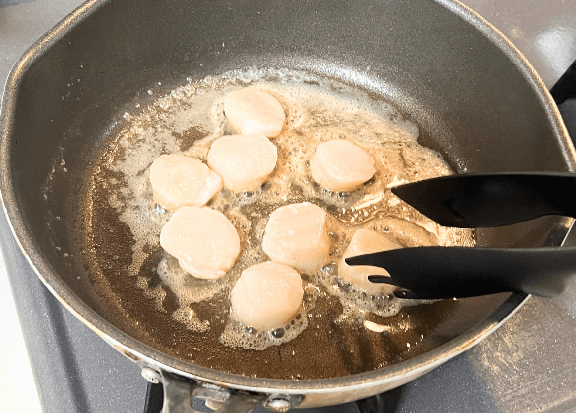 ホタテを入れたら両側の表面をササッと焼き、中心はレアな状態に仕上げて取り出しましょう。