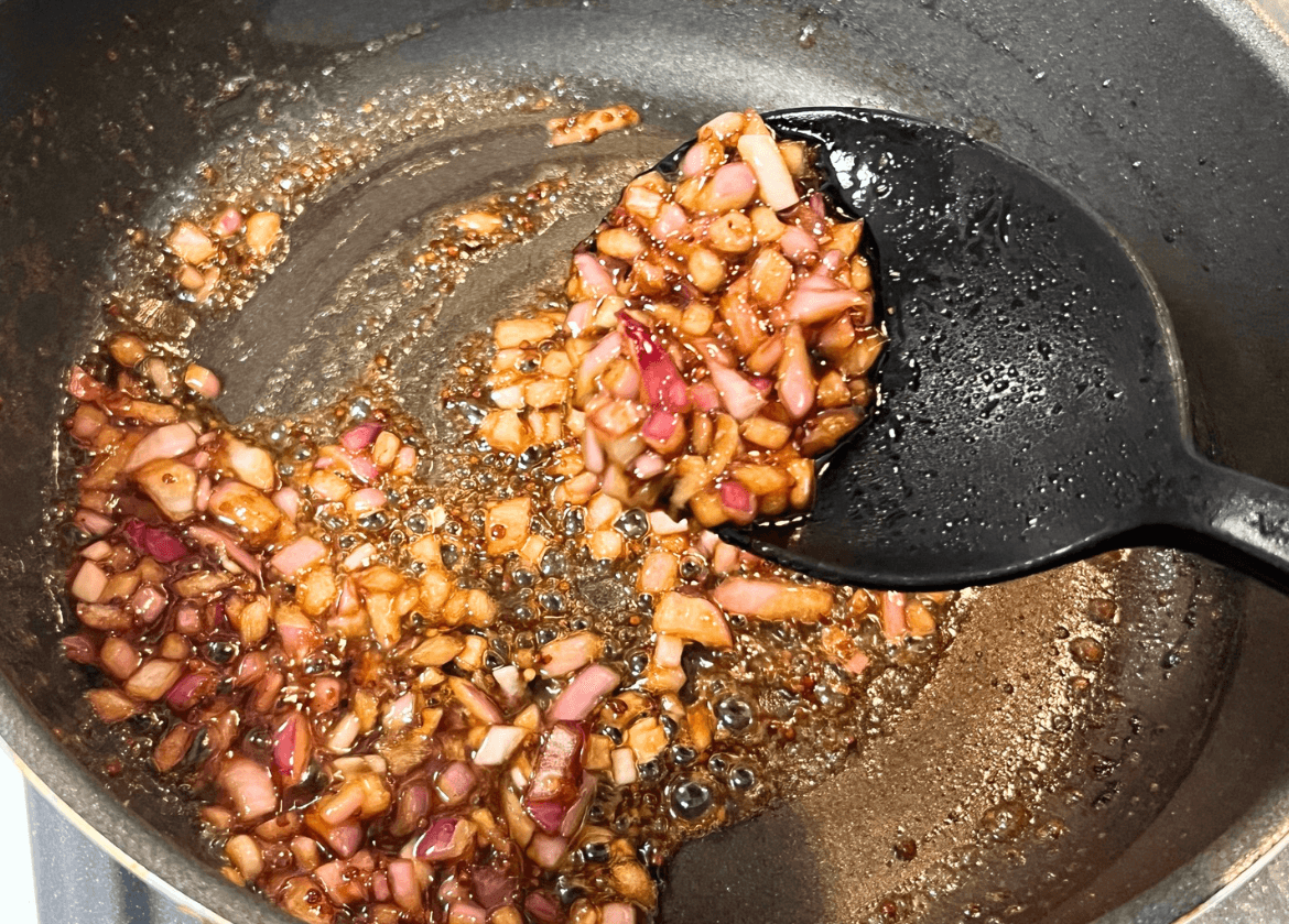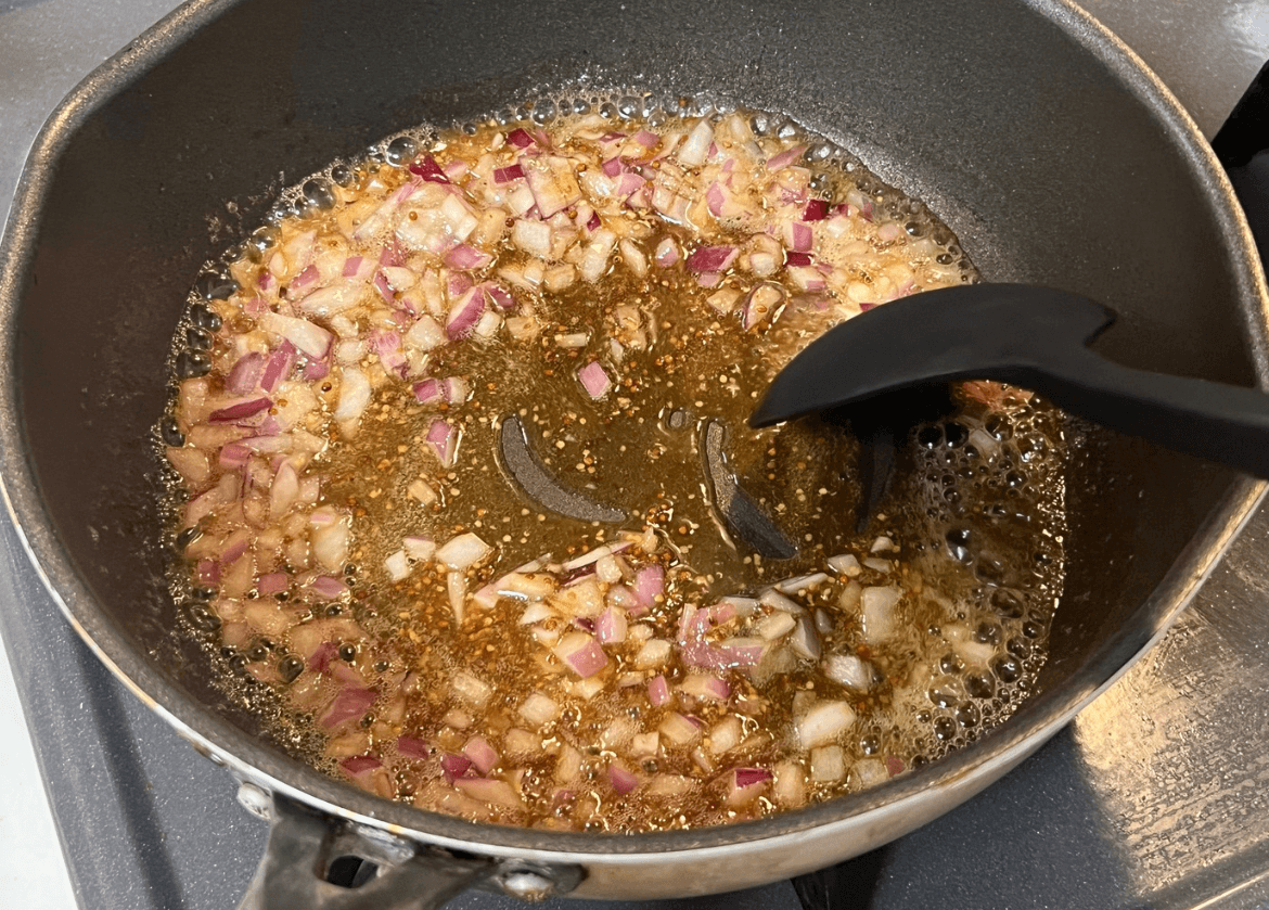 ホタテを焼いた後のオイルが残っているフライパンに、【A】の材料をすべて入れて弱火で軽く煮詰めます。