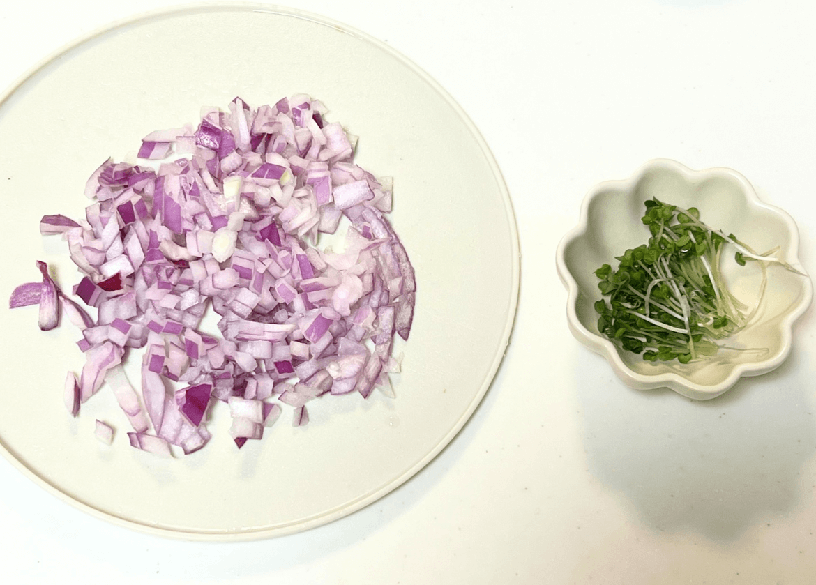紫玉ねぎはみじん切りにし、ブロッコリースプラウトは根元を切り落としておきます。