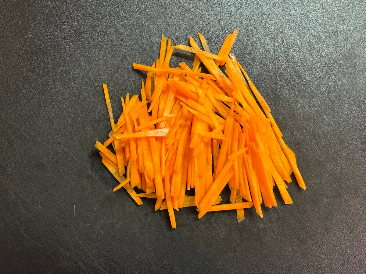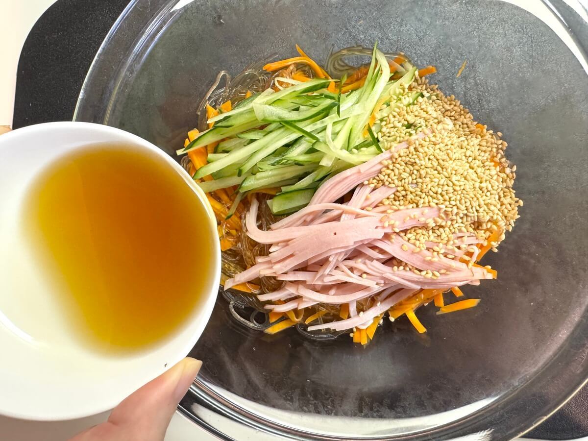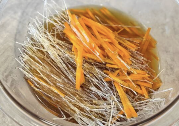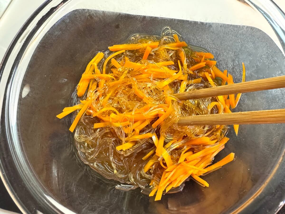 切った緑豆春雨の上に、にんじんをのせ、【A】の調味料を全て加えます。少しなじませるように浸しました。