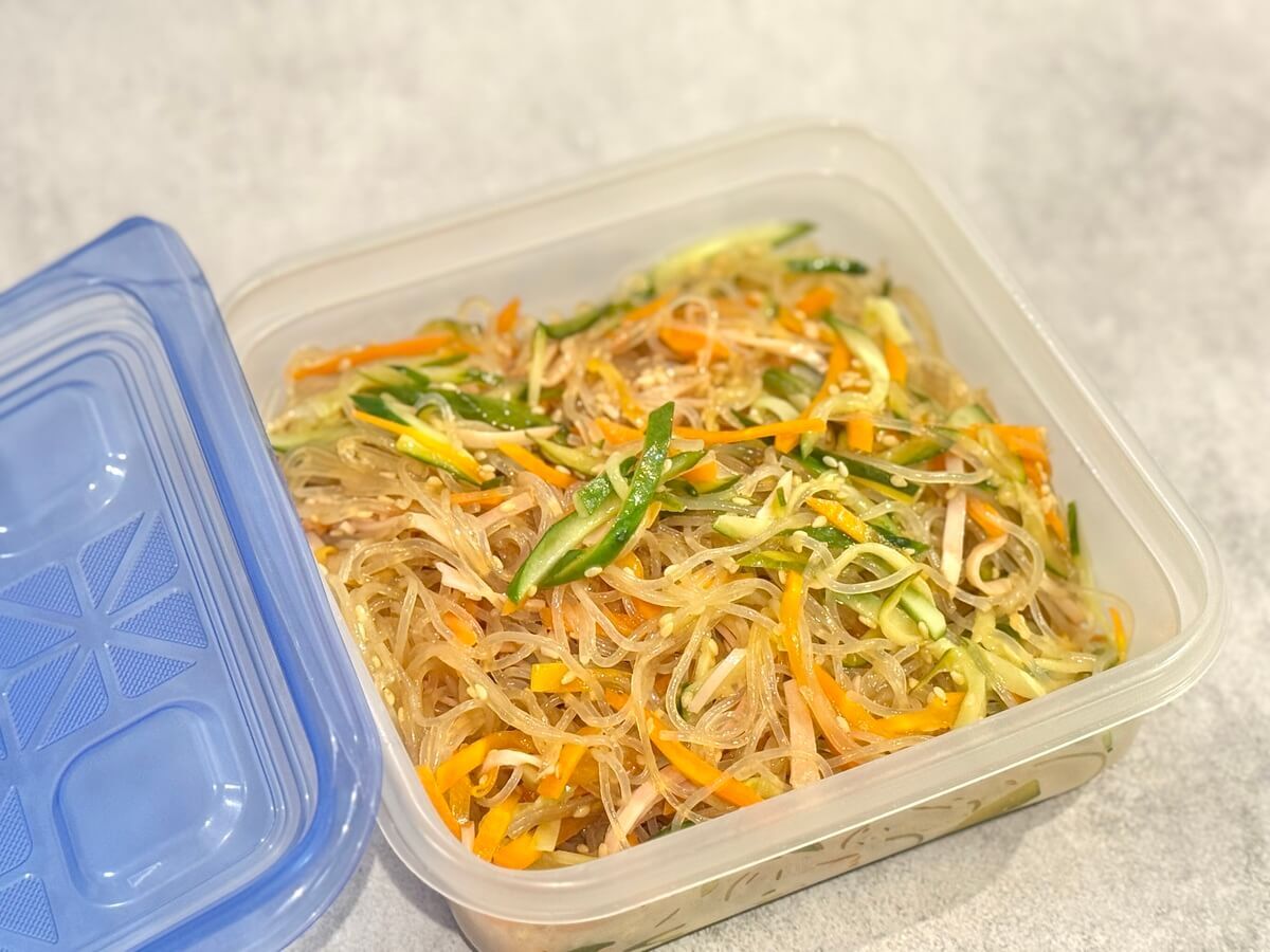 電子レンジ加熱したあとに多めの汁気があっても、混ぜて緑豆春雨に汁がつかるようにおいておけば汁を吸ってくれるので大丈夫です。
