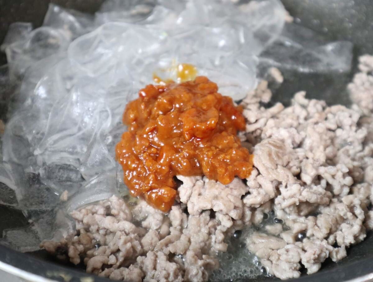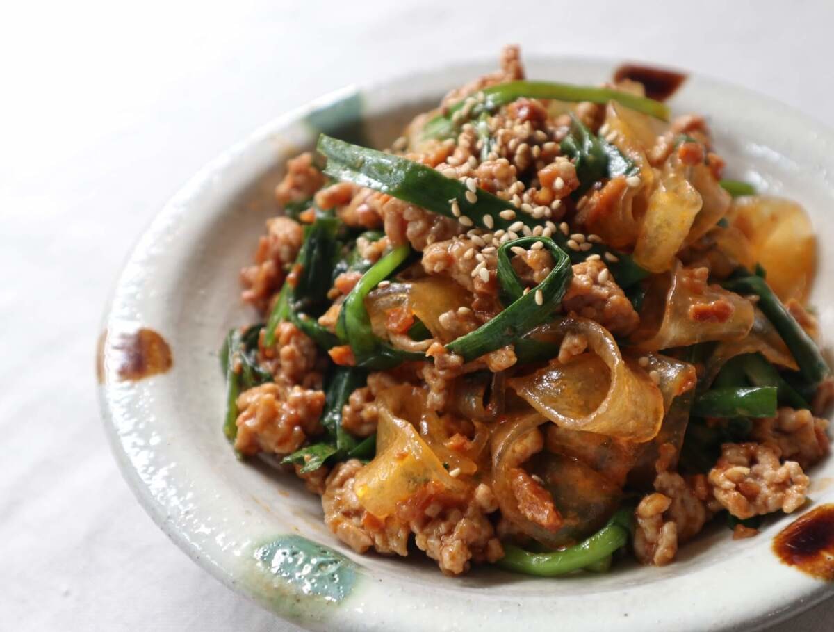 茹でた平麺春雨と甘辛タレを和えたら完成ですが、炒めたひき肉とニラを加えるとボリュームもアップしますし、ご飯のおかずにもなるのでおすすめです。