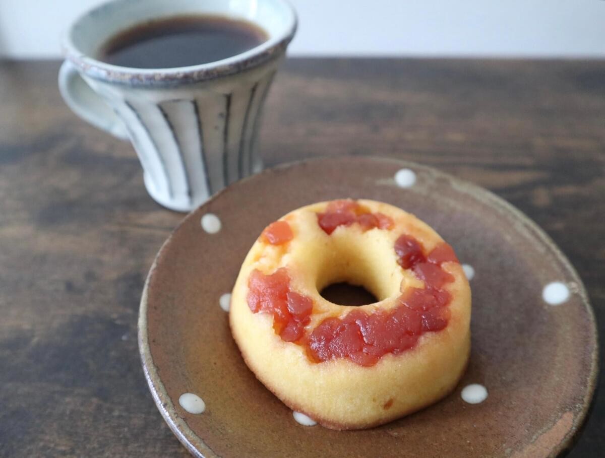 さつまいもペーストが練り込まれた、しっとり食感の焼きドーナツに、甘ずっぱい焼きりんごがトッピングされています。