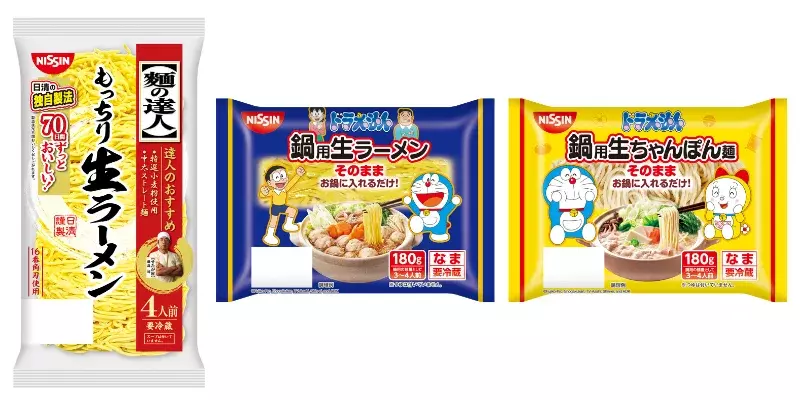 (左から)麺の達人 もっちり生ラーメン 4人前、ドラえもん 鍋用生ラーメン 180g、ドラえもん 鍋用生ちゃんぽん麺 180g