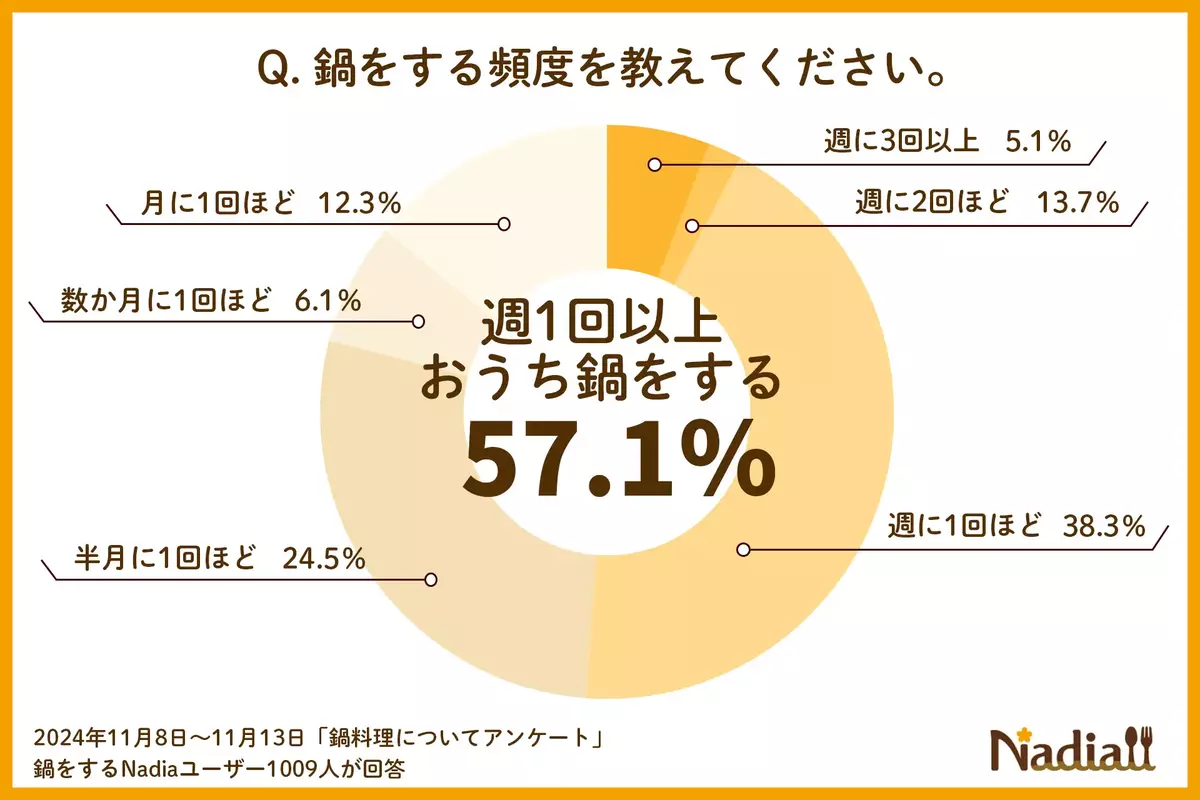おうち鍋の頻度については「週に1回ほど」が最も多く38.3%で、「週に3回以上」「週に2回以上」と合わせて、週1回以上おうち鍋をする人は57.1%いることが分かりました。