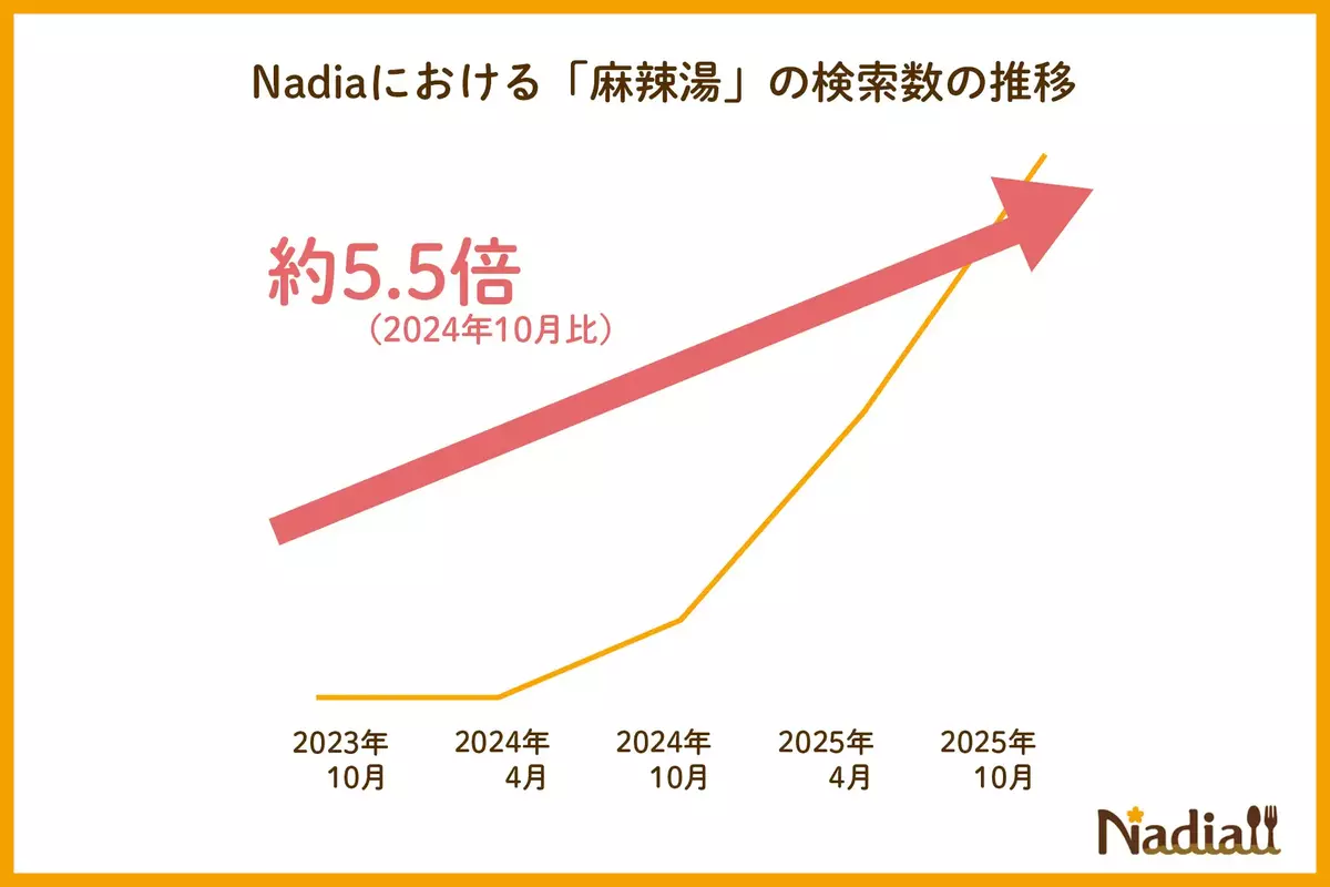 Nadiaアプリ内検索における「麻辣湯(マーラータン)」の検索数は、前年同月(2024年10月比)と比較して約5.5倍に急増。