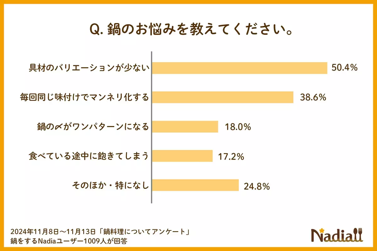 一方、鍋料理に関するお悩みでは、5割超の人が「具材のバリエーションが少ない」と感じており、次いで約4割の人が「毎回同じ味付けでマンネリ化する」と回答。