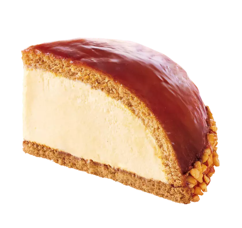 カラメルが染み込んだスポンジの上には、やさしい口どけのカスタードクリーム。天面にも艶やかなカラメルをまとわせて、側面にはアーモンドをトッピング。
