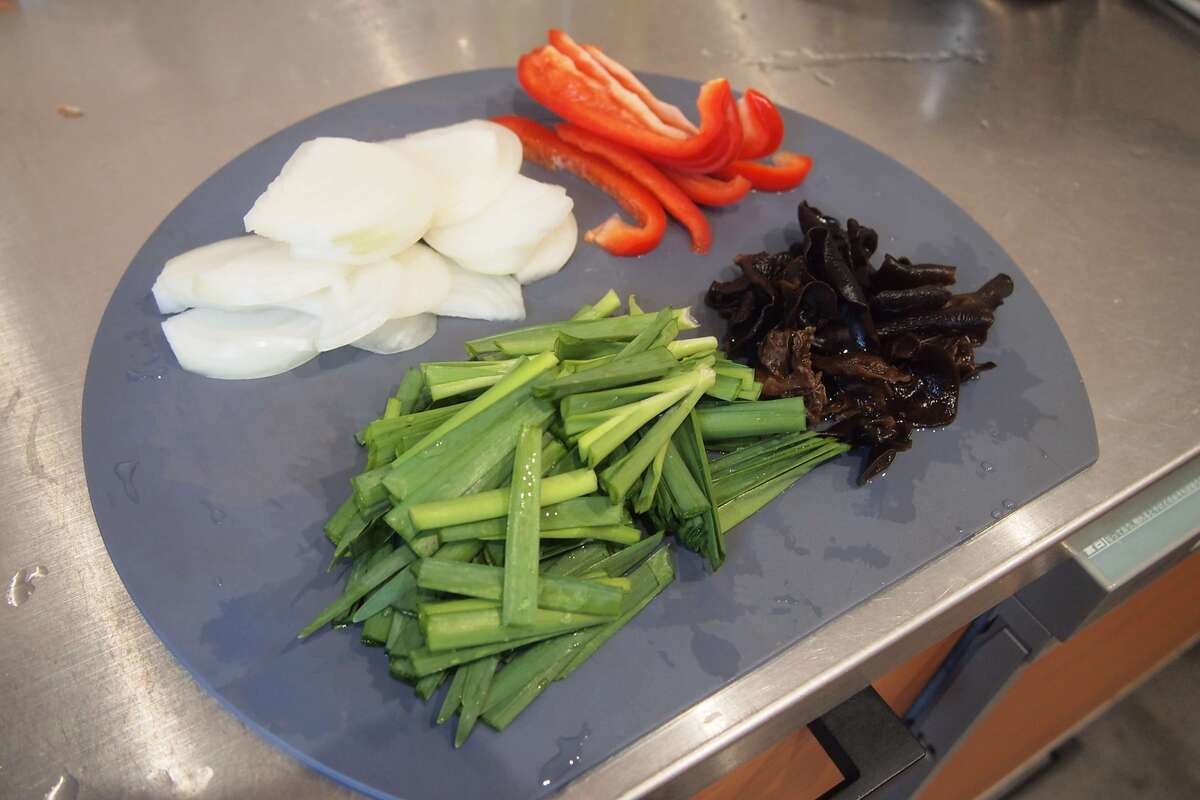 玉ねぎ、パプリカは薄切りにし、ニラはざく切りにします。
