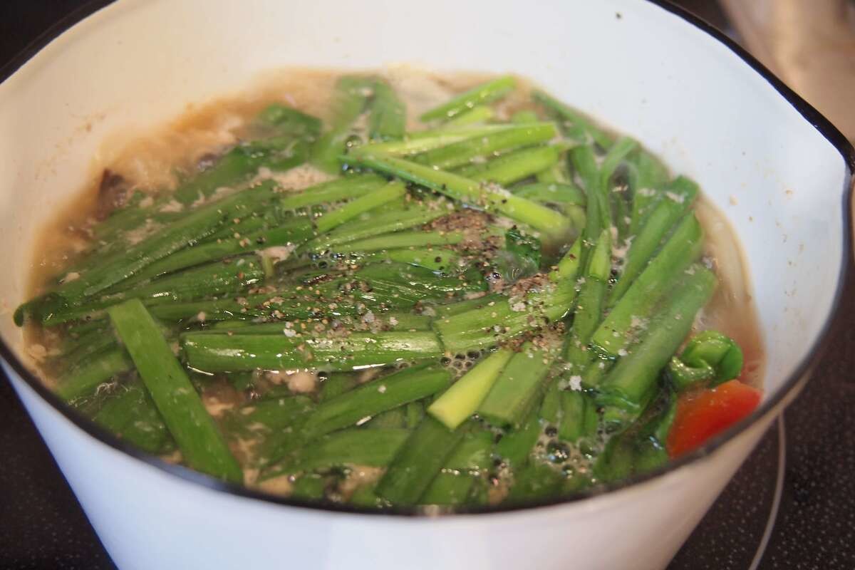 さらに、ニラを入れてさっと火を通し、塩・こしょうで味を調えます。