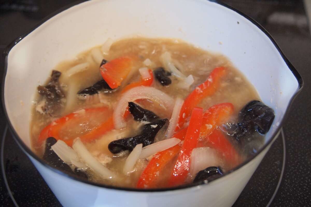 玉ねぎ、パプリカ、黒きくらげ、すりおろしたにんにくと生姜も加え、野菜に火が通るまで煮込みます。