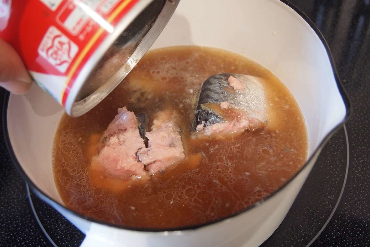 鍋に水、酒、しょうゆ、オイスターソースを入れ、沸騰したらサバ缶を汁ごと投入します。
