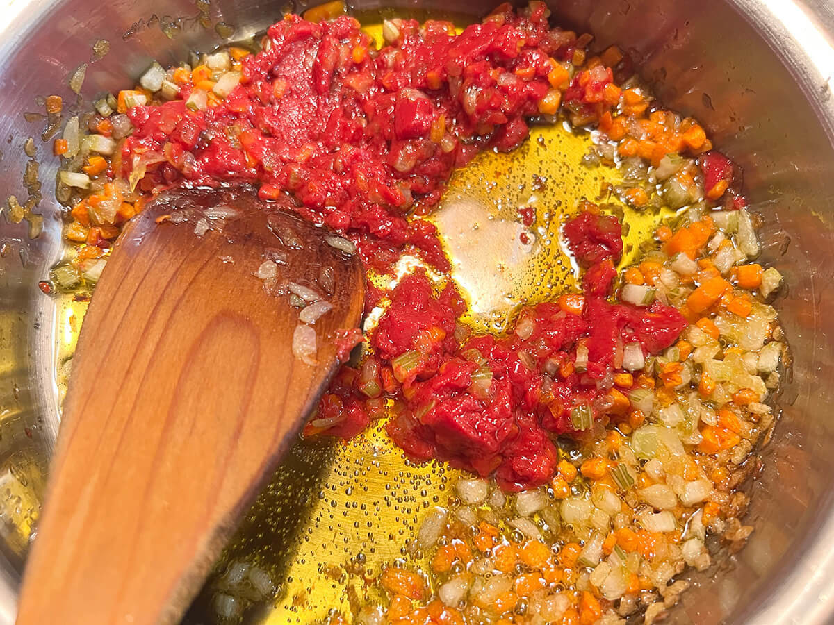 作り方③野菜をじっくり揚げ炒め、トマトペーストとトマトの水煮を加える