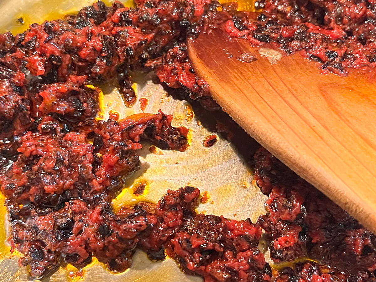 全体がキャラメル色になったら、トマトペーストを加え、さらに2分ほど揚げ炒めます。