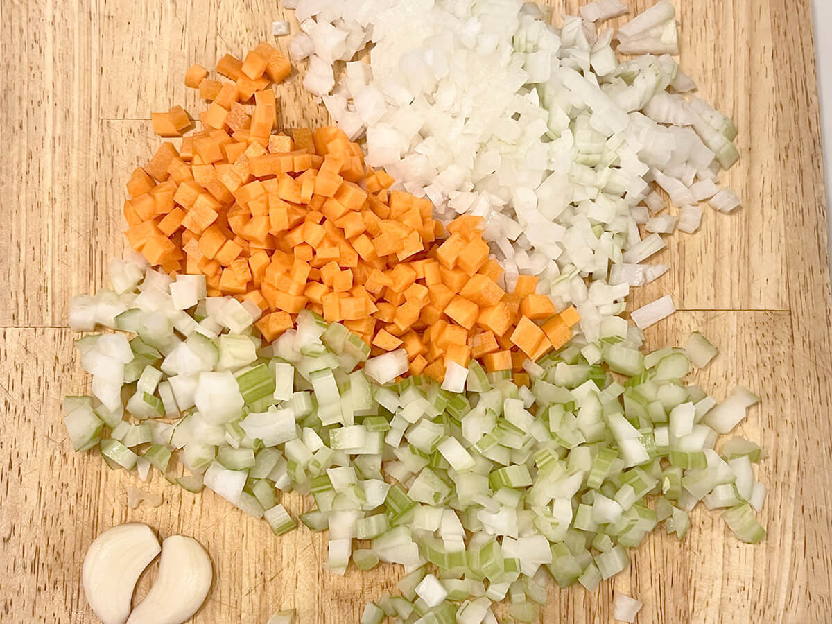 セロリ、玉ねぎ、にんじんを5mm角のさいの目に切ります。焦げる可能性があるので、にんにくは刻まずに潰しておくだけにしましょう。