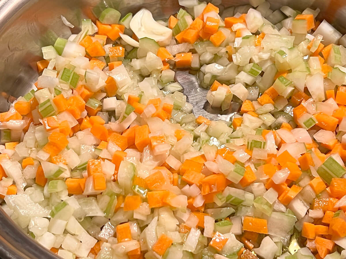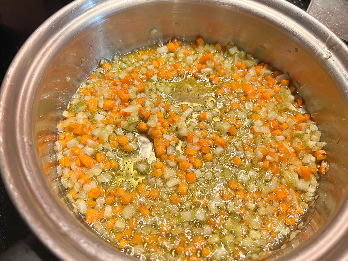 鍋にセロリ・玉ねぎ・にんじん・にんにくを入れ、オリーブオイルを回しかけます。最初は強火にかけ、オリーブオイルが温まったら中火にし、30分を目安に混ぜながら揚げ炒めましょう。