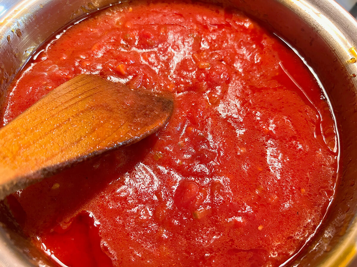 その後トマトの水煮を加え、つぶしながら軽く混ぜたら一旦火を止めましょう。ふー。どうにかここまでできました。