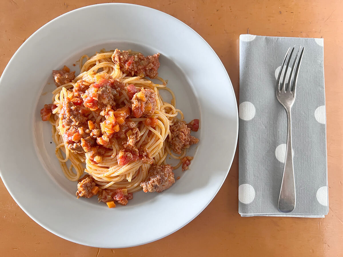 よく考えるとソースには塩も砂糖も入っていないけれど、30分かけて炒めた野菜の甘さとトマトペーストのコク、パスタを茹でる時に入れた塩だけで、ピシリと味が決まっています。