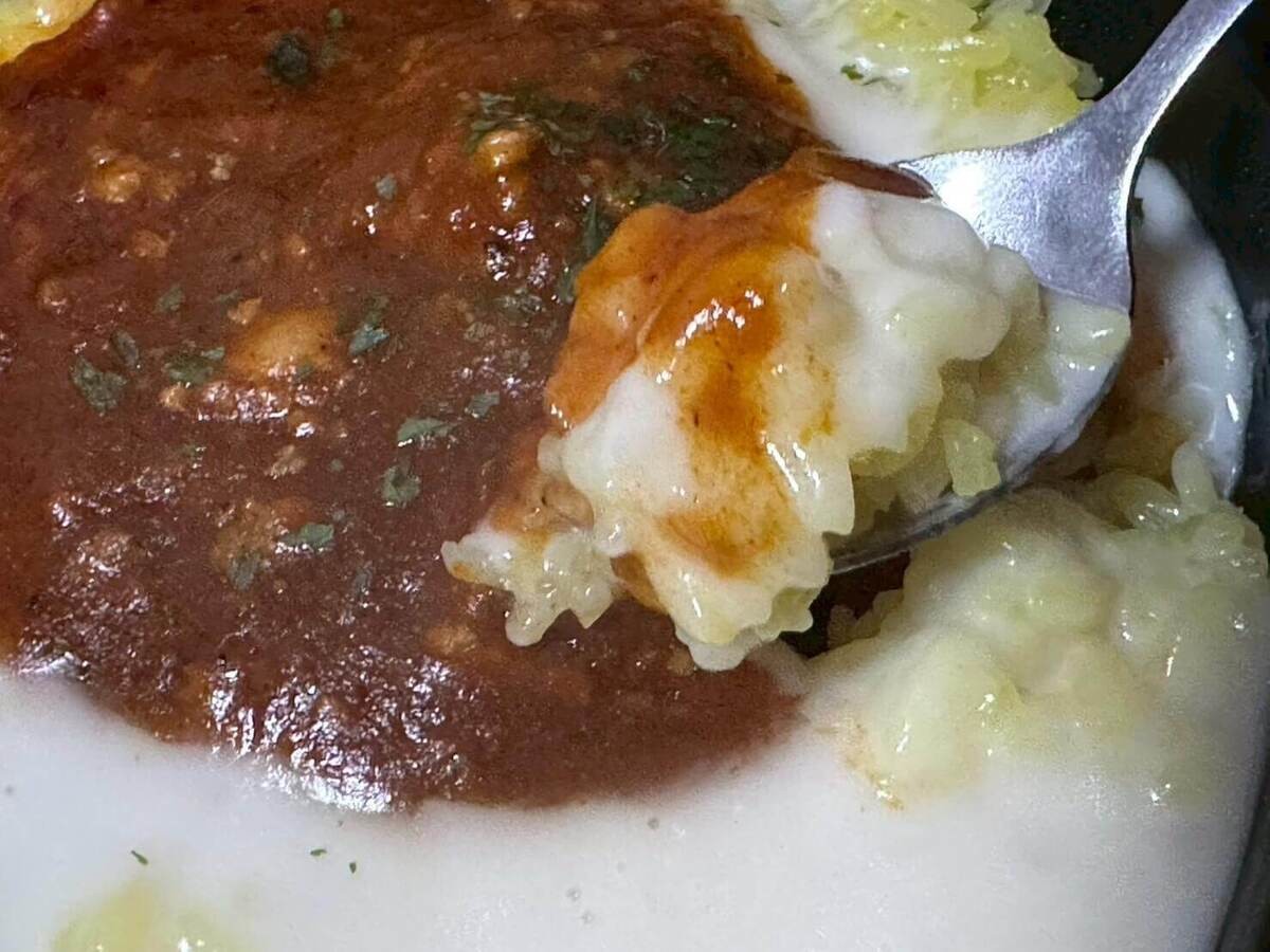 上からかかったトマトソースは、酸味だけじゃなく甘みとコクもあって、ごはん系のおかずとして成立する味。