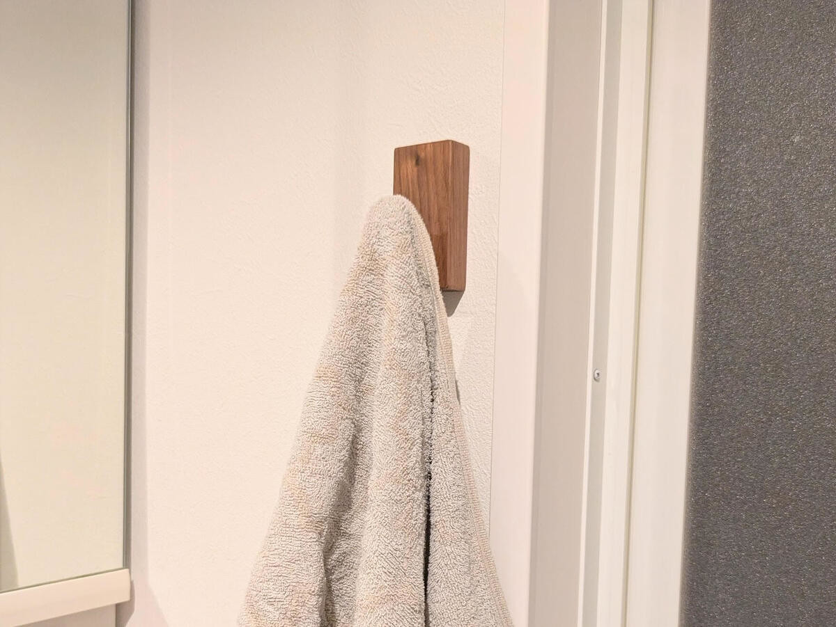 洗面所には、タオル掛けがなかったため、こちらのフックを設置しました。5分たらずで使い勝手の良い空間に大変身。